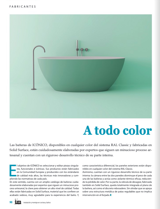 Las bañeras de ICÓNICO, disponibles en cualquier color del sistema RAL Classic y fabricadas en Solid Surface, están cuidadosamente elaboradas por expertos que siguen un minucioso proceso artesanal y cuentan con un riguroso desarrollo técnico de su parte interna