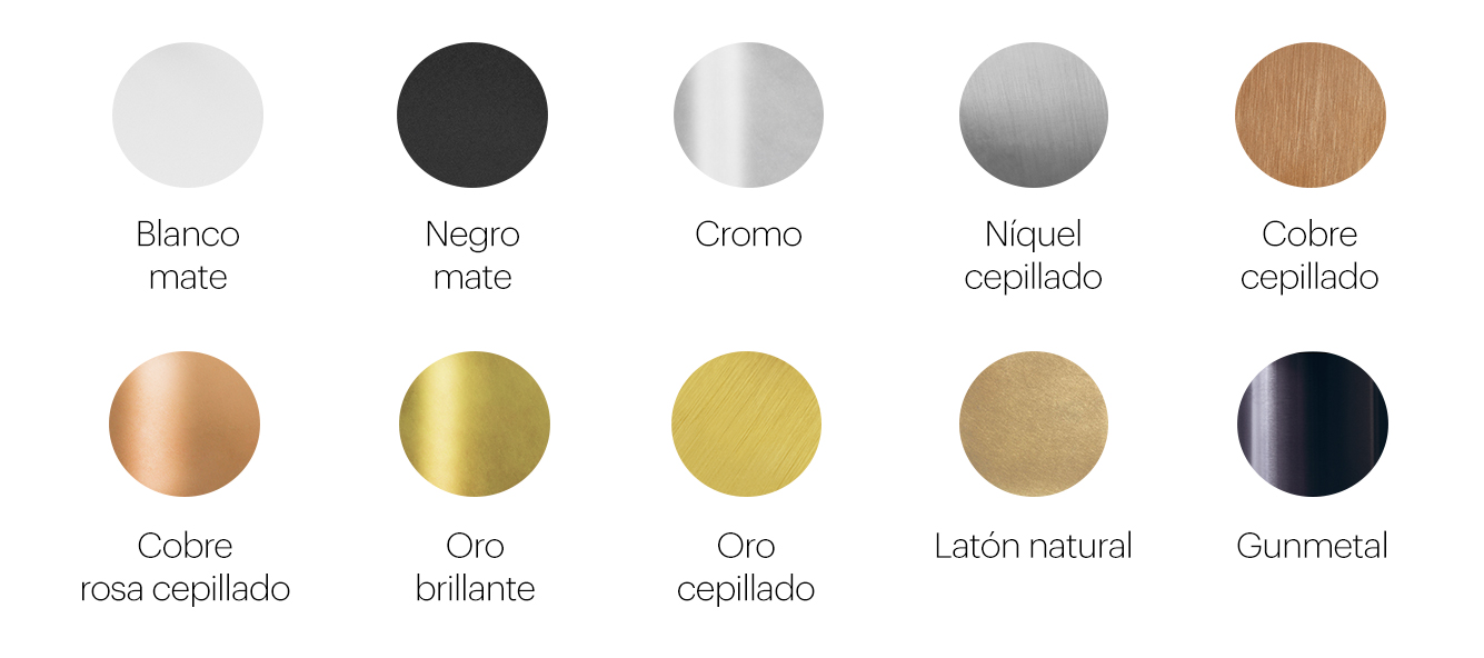 Esta colección está disponible en 10 acabados: cromo, negro mate, blanco mate, níquel cepillado, cobre o cobre rosa cepillado, oro brillante o cepillado, gunmetal y latón natural.