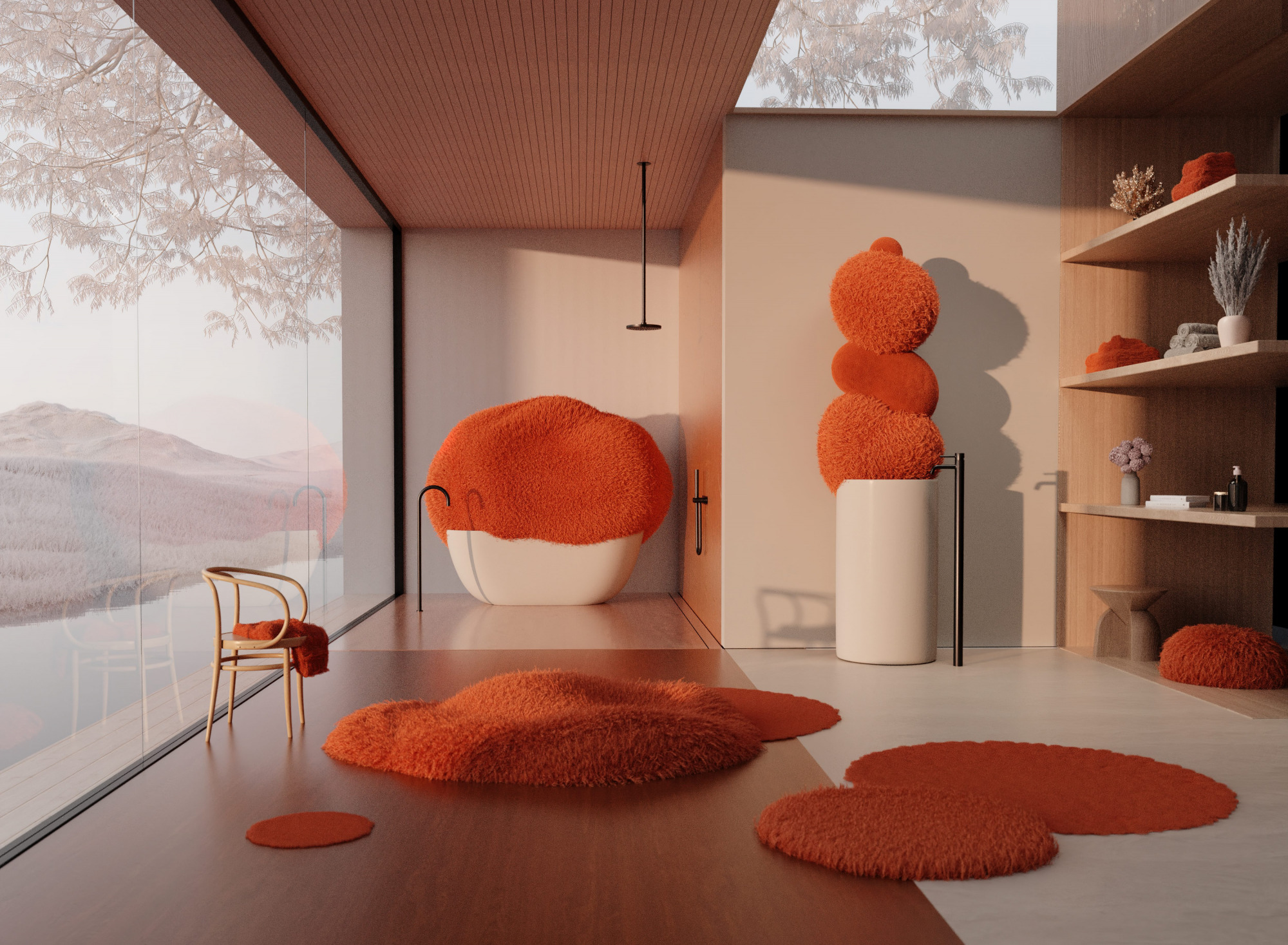 Este baño visualmente llamativo presenta grandes formas abstractas de un material y color muy particular, mostrado en una diversidad de opciones decorativas, la belleza de la estética no convencional.