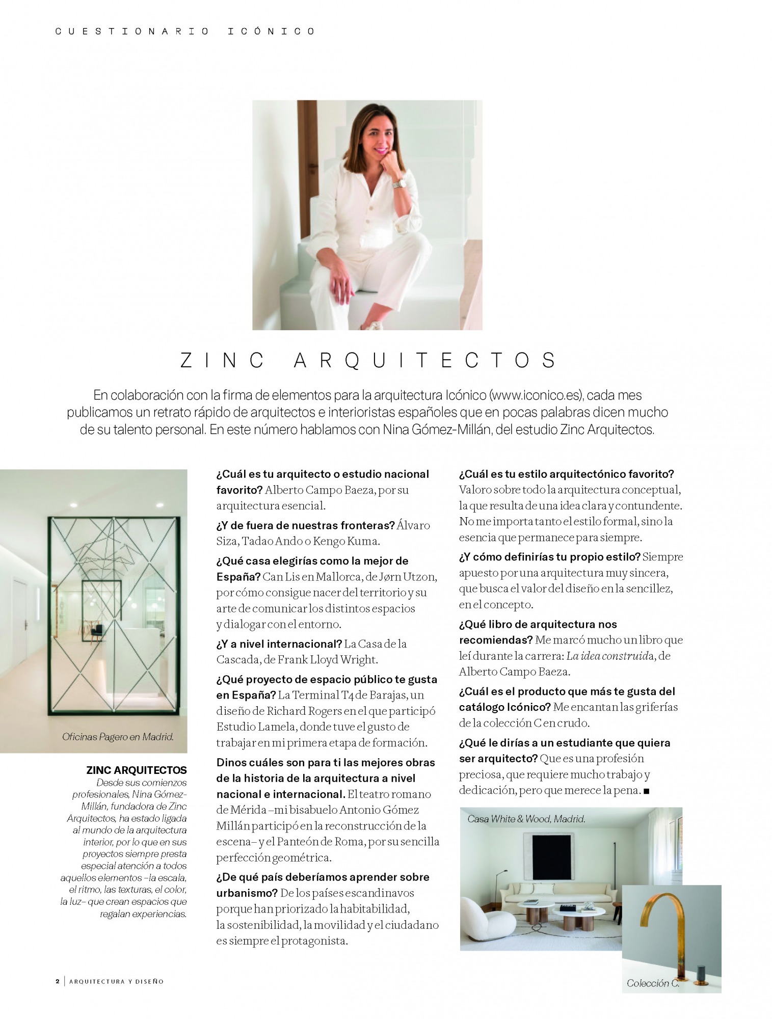 En colaboración con la firma de elementos para la arquitectura Icónico (www.iconico.es), AyD publica esta sección mensual, un retrato rápido de arquitectos e interioristas españoles que en pocas palabras dicen mucho de su talento personal. En este número hablamos con Nina Gómez-Millán, del estudio Zinc Arquitectos.