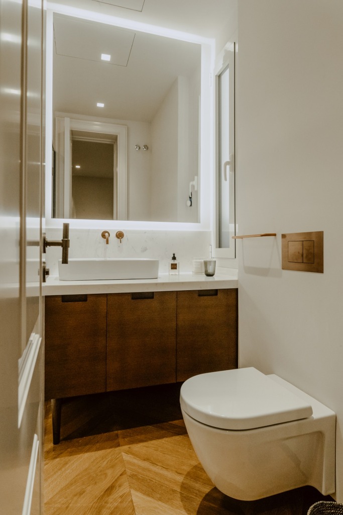 Los tonos de casa son claros, de líneas clásicas y suelos nobles, aunque el lenguaje del concepto oscuro del cubo contagia algunos elementos arquitectónicos como puertas y grifería.