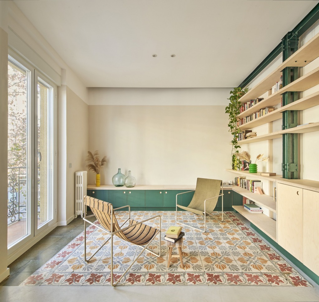 Los pavimentos originales son sinceros y conservan la morfología de la antigua distribución, rematada con microcemento. La estructura metálica se desnuda y se fusiona e incluye en la vivienda mediante el color verde, formando parte del conjunto de carpintería y espacios. La cocina también forma parte del paquete de carpintería y hace las funciones de catalizador entre el espacio principal de salón y el resto de la vivienda con una diagonal que se abre hacia la luz.