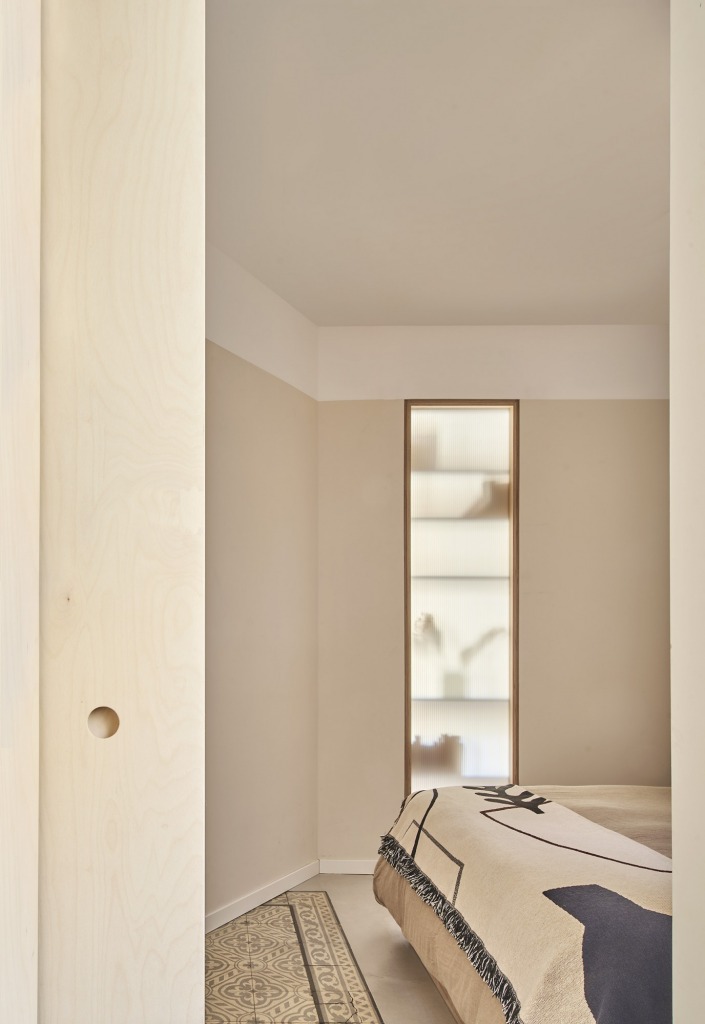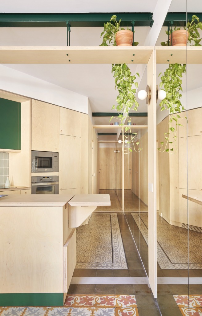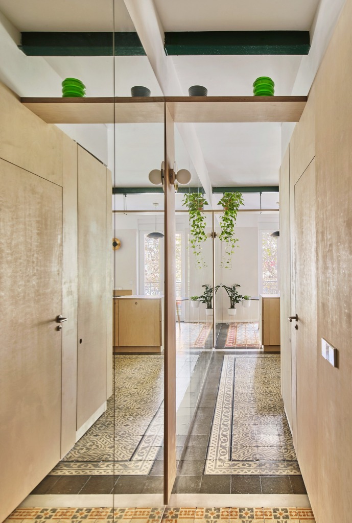 La intervención gira en torno a un paquete de usos más privados camuflados en la carpintería de madera que incluye y unifica la cocina, los accesos a los dormitorios y a los baños y maximiza el almacenaje disponible. Además, la madera de abedul contrasta con los solados existentes y el gran espejo longitudinal multiplica el espacio del distribuidor que conecta desde la entrada hasta el espacio de salón-comedor con balcones al exterior y refleja la luz natural de un extremo a otro de la vivienda.