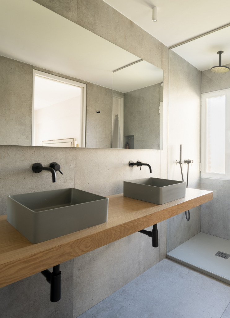 Se aporta calidez gracias a la utilización de madera de roble teñido tanto en suelos como en el panelado que separa el programa de día con el programa de noche. Algunas notas de color en gris oscuro y negro dialogan con el hormigón oscuro, aportando un toque masculino a la vivienda.