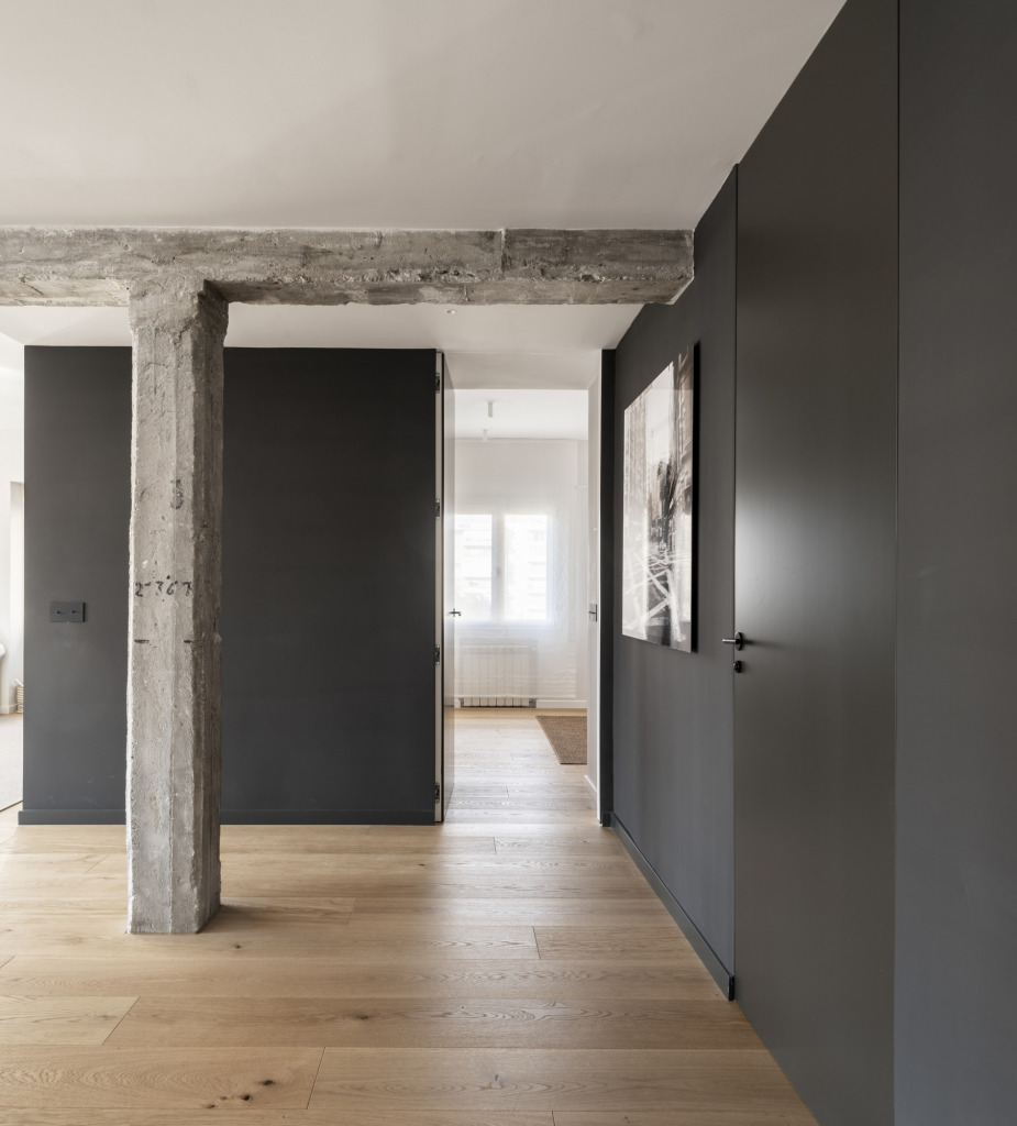 Se trata de una reforma de una vivienda ubicada en un edificio de los años 70 con la característica estructura de hormigón de la construcción de la época. Se recupera esta estructura dejando tanto vigas como pilares vistos y se busca resaltar la textura del hormigón, contrastándolo con colores neutros en el resto de materiales.