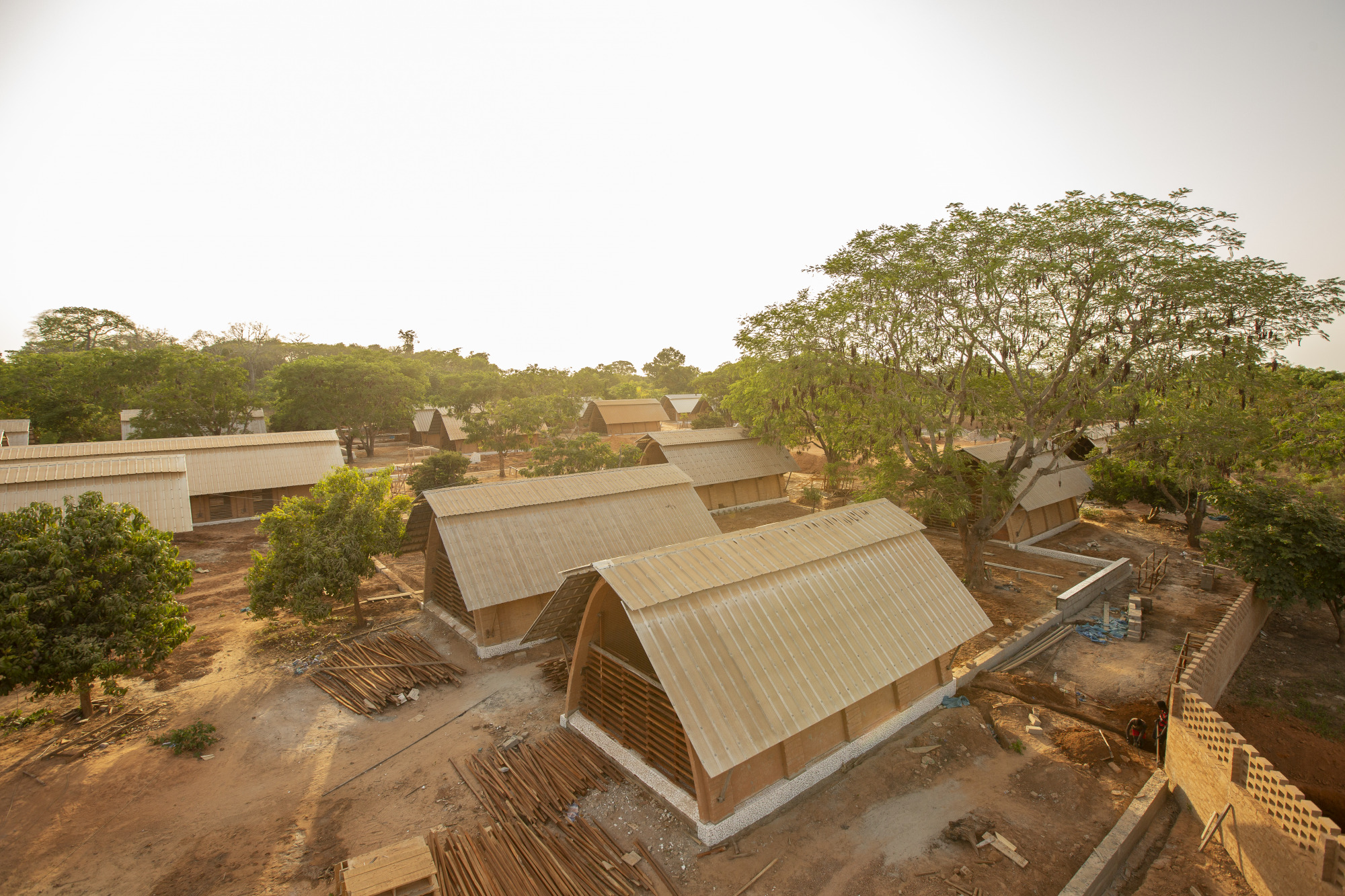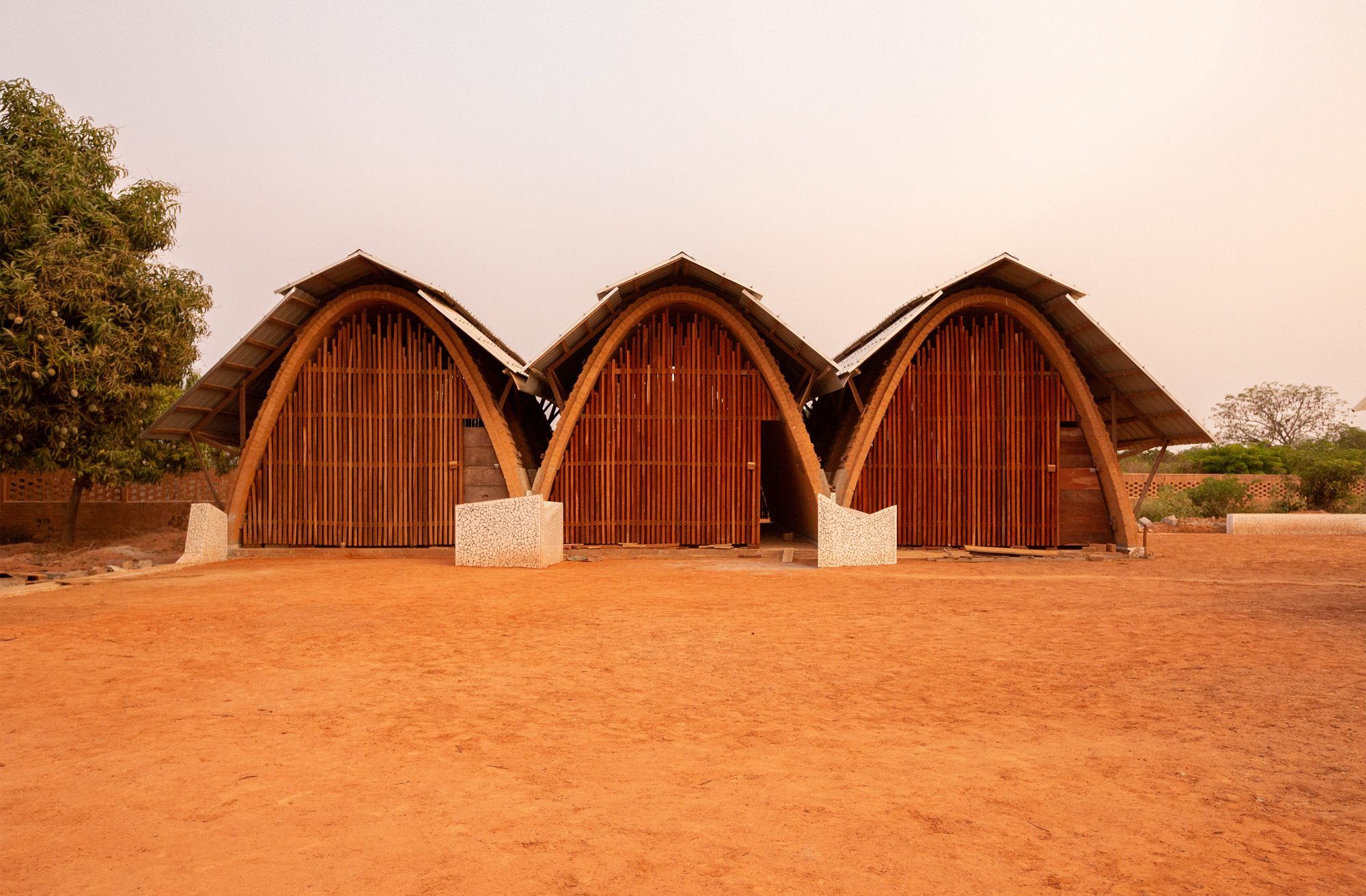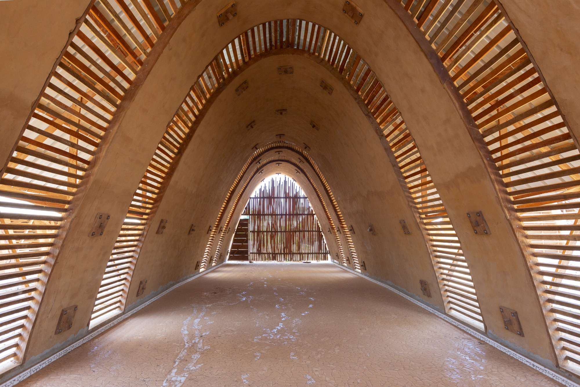 Los módulos se han realizado con la arcilla trabajada a compresión, utilizando una geometría de bóvedas en catenaria para cerrar el espacio. Estas están cubiertas por una chapa grecada metálica que evita la lluvia sobre la arcilla y las fachadas se han cubierto con dos celosías de madera que permiten la iluminación y la circulación del aire. De este modo, se evita la necesidad de utilizar sistemas de climatización mecánicos.