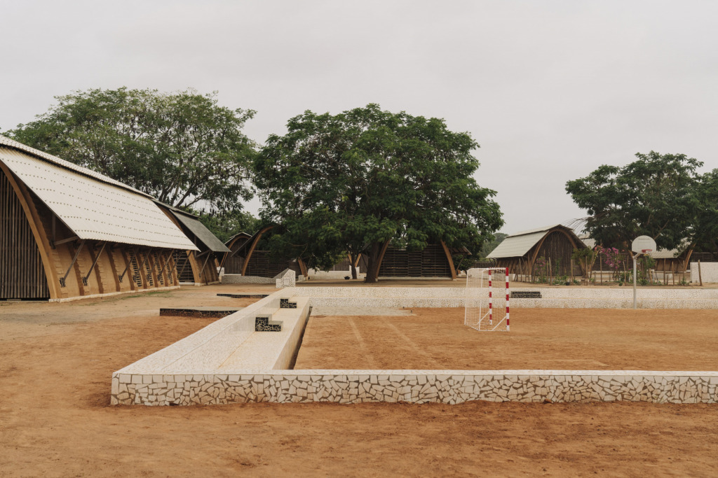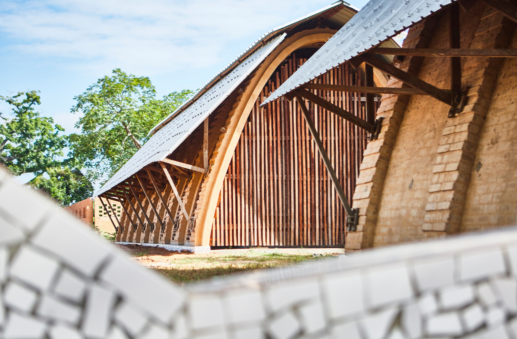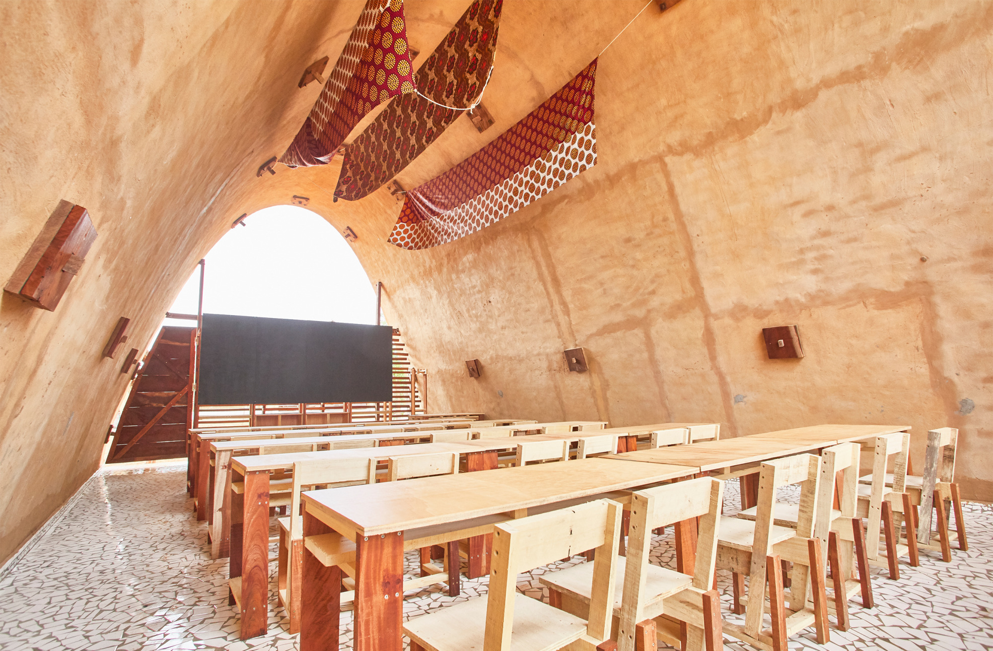 Los módulos se han realizado con la arcilla trabajada a compresión, utilizando una geometría de bóvedas en catenaria para cerrar el espacio. Estas están cubiertas por una chapa grecada metálica que evita la lluvia sobre la arcilla y las fachadas se han cubierto con dos celosías de madera que permiten la iluminación y la circulación del aire. De este modo, se evita la necesidad de utilizar sistemas de climatización mecánicos.