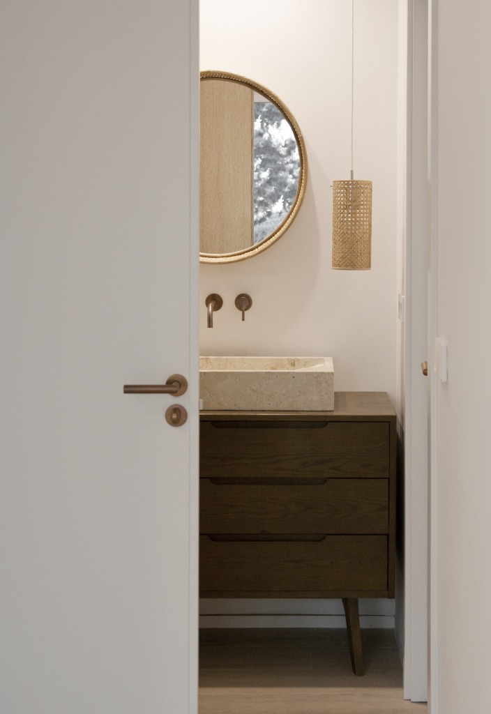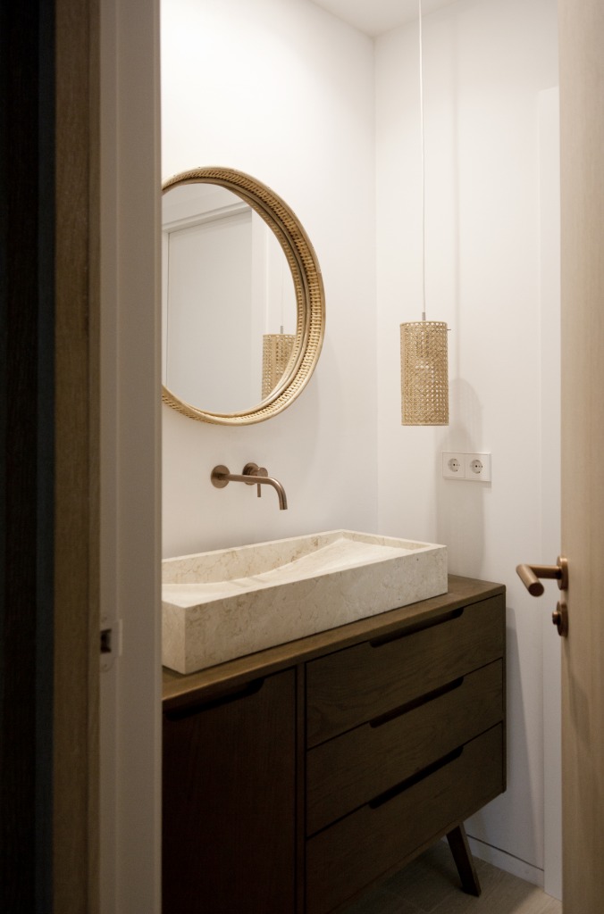 Exterior e interior se vuelven uno en esta vivienda. Las fibras, colores y texturas presentes en la naturaleza se incorporan en el espacio para dotarlo de esa calidez que requiere un hogar. Las costuras de las lámparas de mimbre, los fósiles del lavabo de mármol y la veta de la madera del friso hipnotizan a la vez que envuelven el espacio. La búsqueda de la luz a través de la cocina hizo el resto y se convirtió en el centro de atención de las miradas.