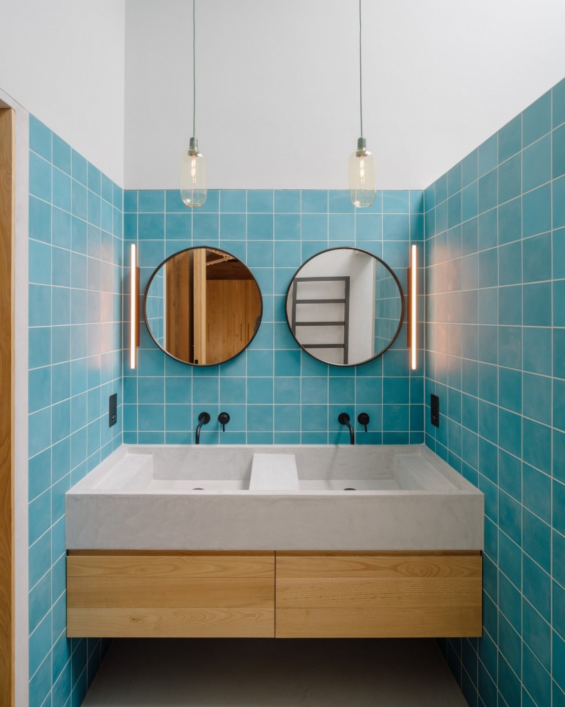 Cada baño es diferente, incluye bañeras y duchas iluminadas naturalmente por claraboyas. Cada uno tiene un color diferente utilizando tonos de pinturas minerales a juego con los colores principales de los azulejos encáusticos. Los espejos están formados por dos círculos con un fino borde metálico negro.