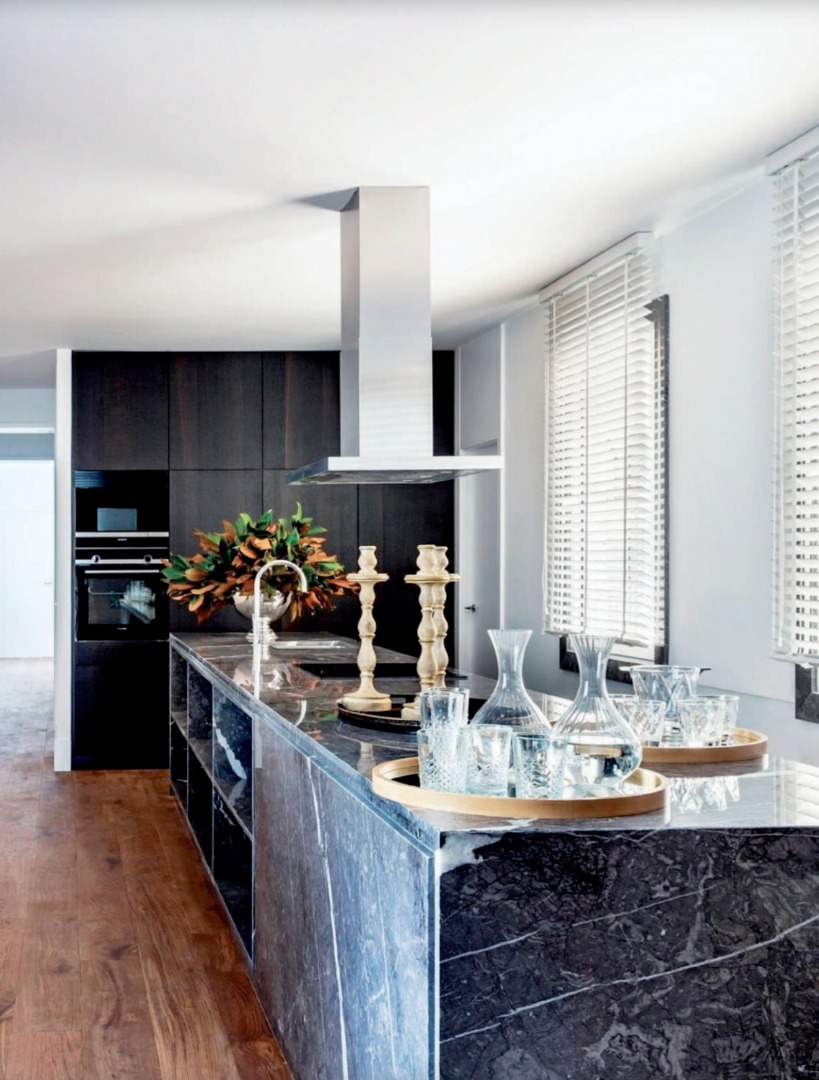 La isla central, revestida con mármol griego. Los candeleros son de Balik Hanmade y la grifería, de Icónico.