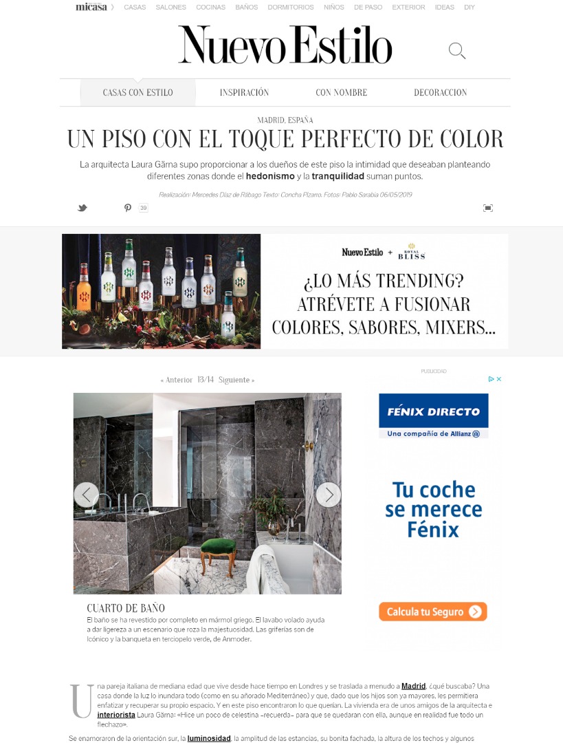 El baño se ha revestido por completo en mármol griego. El lavabo volado ayuda a dar ligereza a un escenario que roza la majestuosidad. Las griferías son de Icónico y la banqueta en terciopelo verde, de Anmoder.